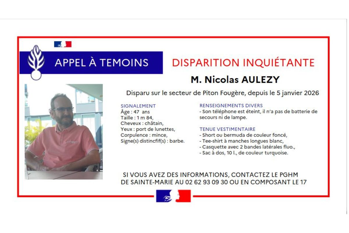Depuis ce lundi 5 janvier 2026, l’inquiétude grandit à La Réunion. Nicolas Aulezy, 47 ans, est porté disparu après être parti en randonnée dans le secte […] - En afficher davantage